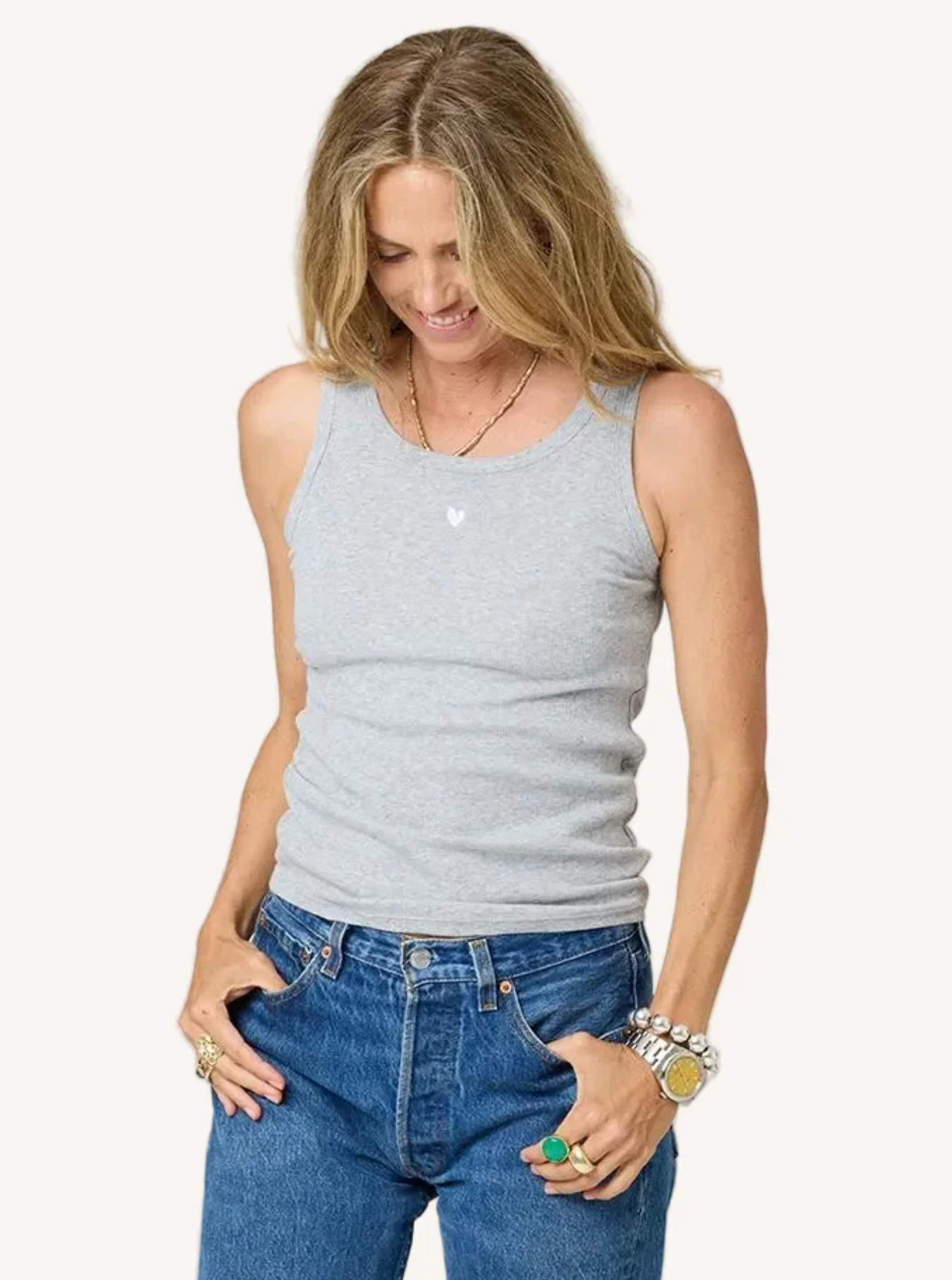 The KR tank in heather gray is the perfect layer under everything, from summer to fall and every other time of the year. Made from cotton spandex, this tank is flattering in all the right ways.