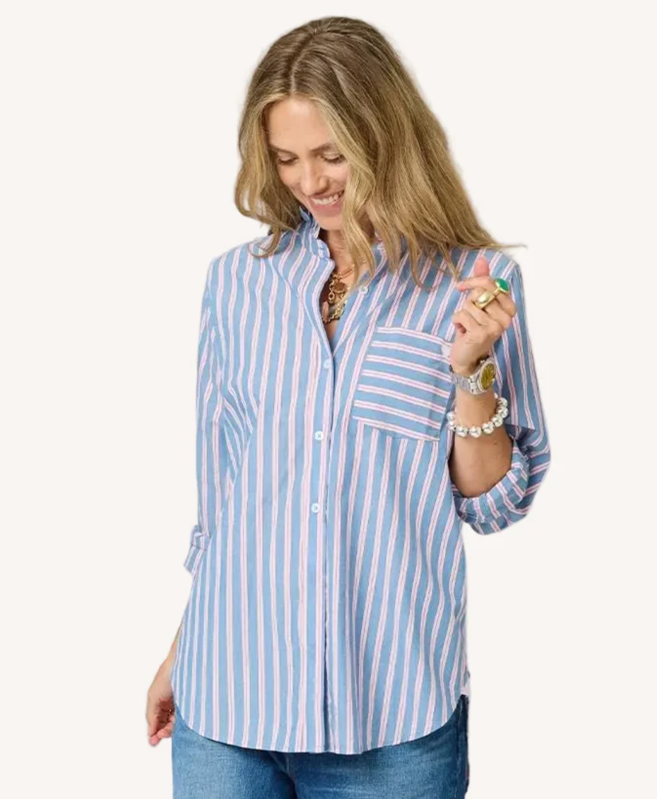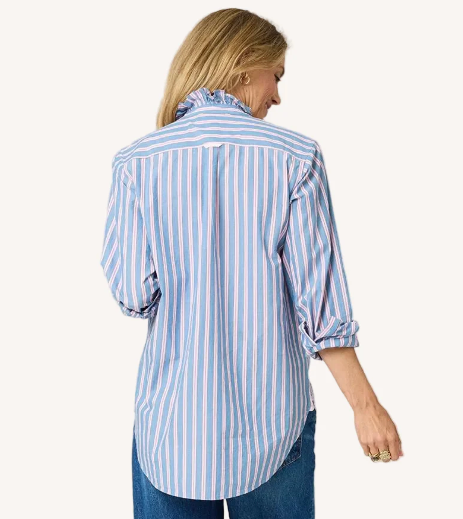 The Mia Ruffle Stripe Shirt in crisp cotton with a delicate ruffle collar that feels both playful and quietly polished. Wear it buttoned all the way up or left open just enough. Tuck it, layer it, live in it, sleep in it.