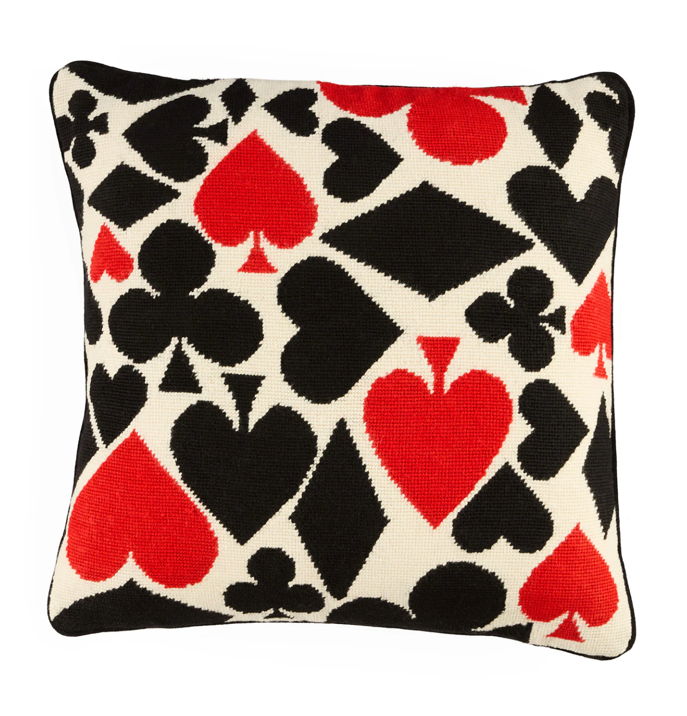 All bets are on. From Diana Vreeland's iconic red room to the storied extravagance of Monte-Carlo, playing card motifs have always signified jet set glamour. Our Dealer's Choice needlepoint pillows are a bold way to up the ante on your sofa, seats, and bedscapes. Each pillow is embroidered by hand and backed in luxe velvet. Forget the fusty needlepoint of yore and embrace our sharp, chic world.