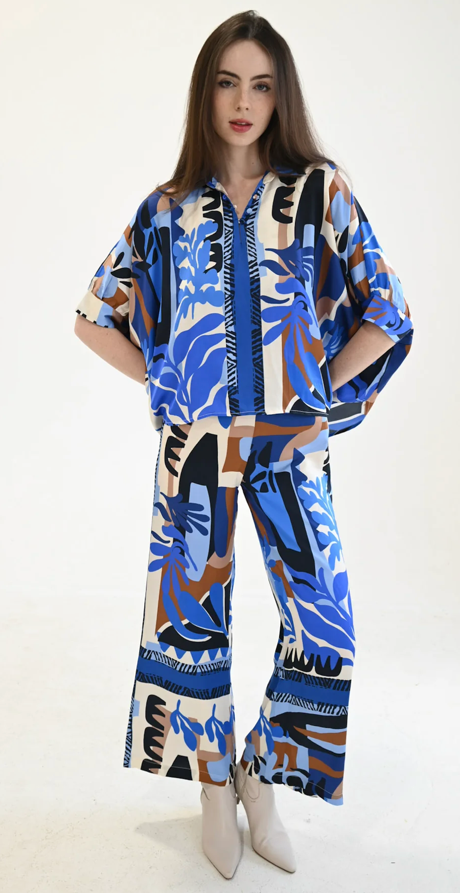 Make a bold impression with this artful statement top. Designed in a lightweight woven fabric, it features a striking abstract print that blends rich blues, warm neutrals, and graphic black accents for a modern, gallery-inspired look. The relaxed silhouette is complemented by a notched neckline with contrast trim, adding definition while keeping the fit effortless. Short dolman sleeves enhance the easy drape, making this top both comfortable and eye-catching