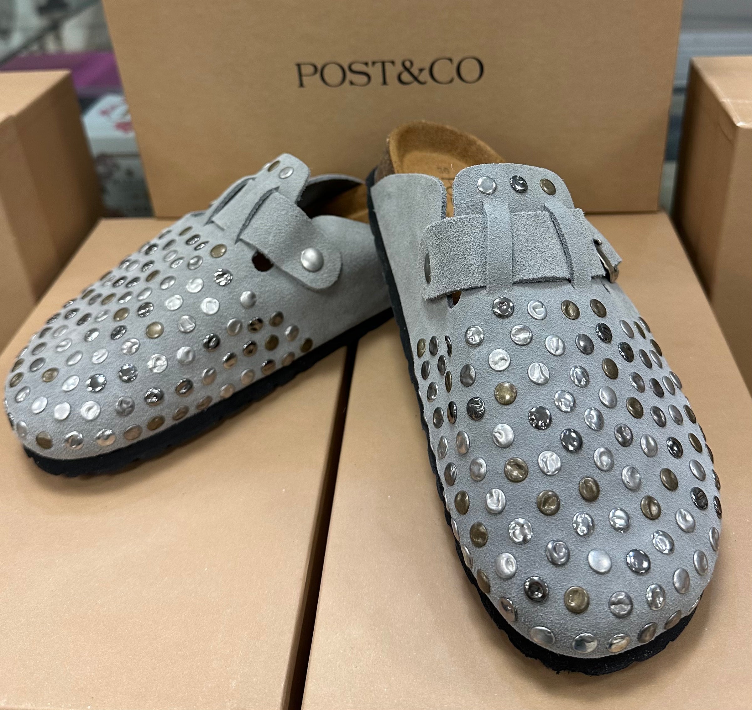 Leather clogs, grey suede, leather lining, metal studs. round toe, flat, rubber cleated sole, contains non-textile parts of animal origin